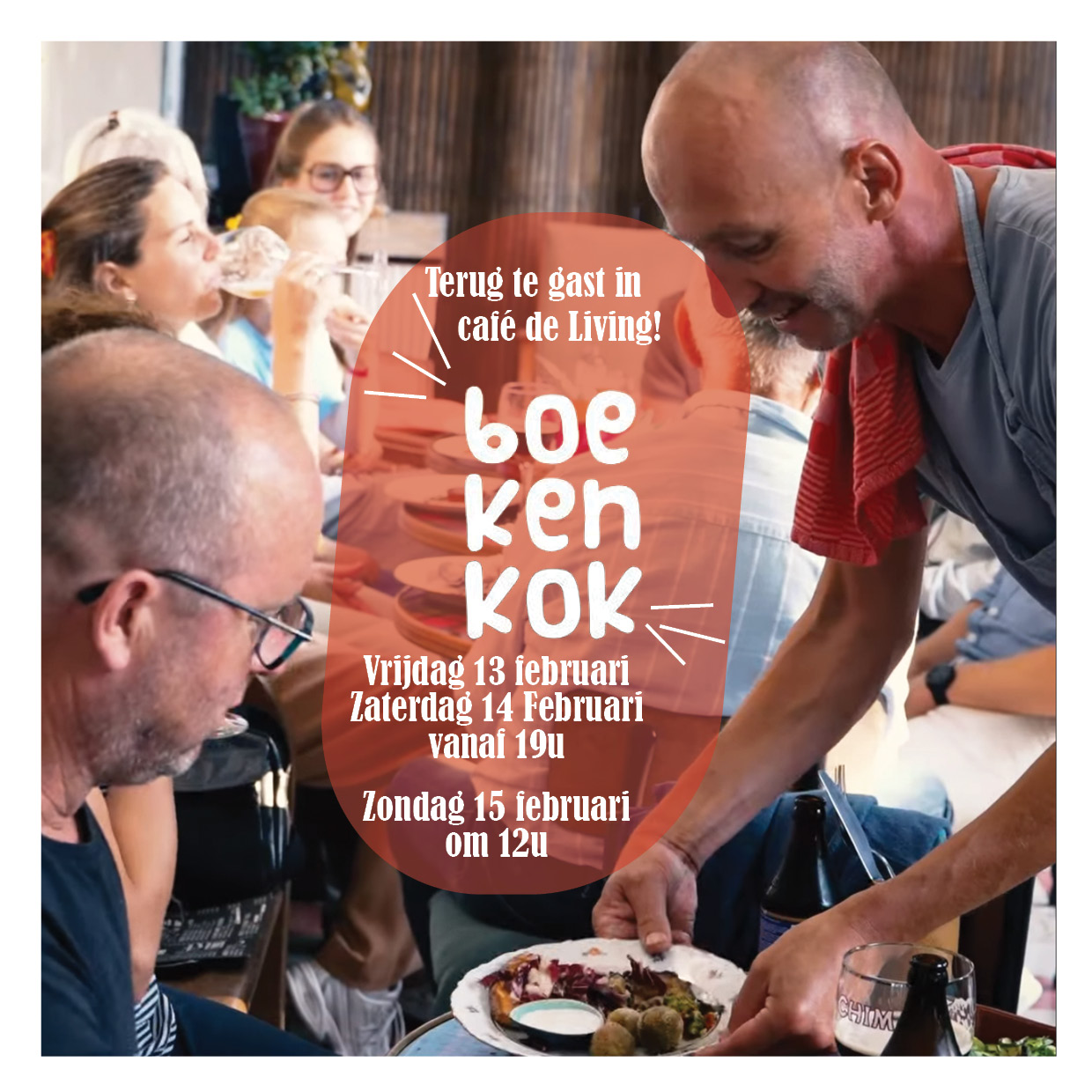 De Boekenkok neemt opnieuw een weekend lang de keuken van cafe de Living open! Welkom op vrijdag 13 februari vanaf 19u, zaterdag 14 februari vanaf 19u of zondag 15 februari vanaf 12u. Valentijn-menu €28 (heerlijk à volonté!) Apero: Naanbrood met artisjokdip Sticky kastanjepaddestoel met pinda