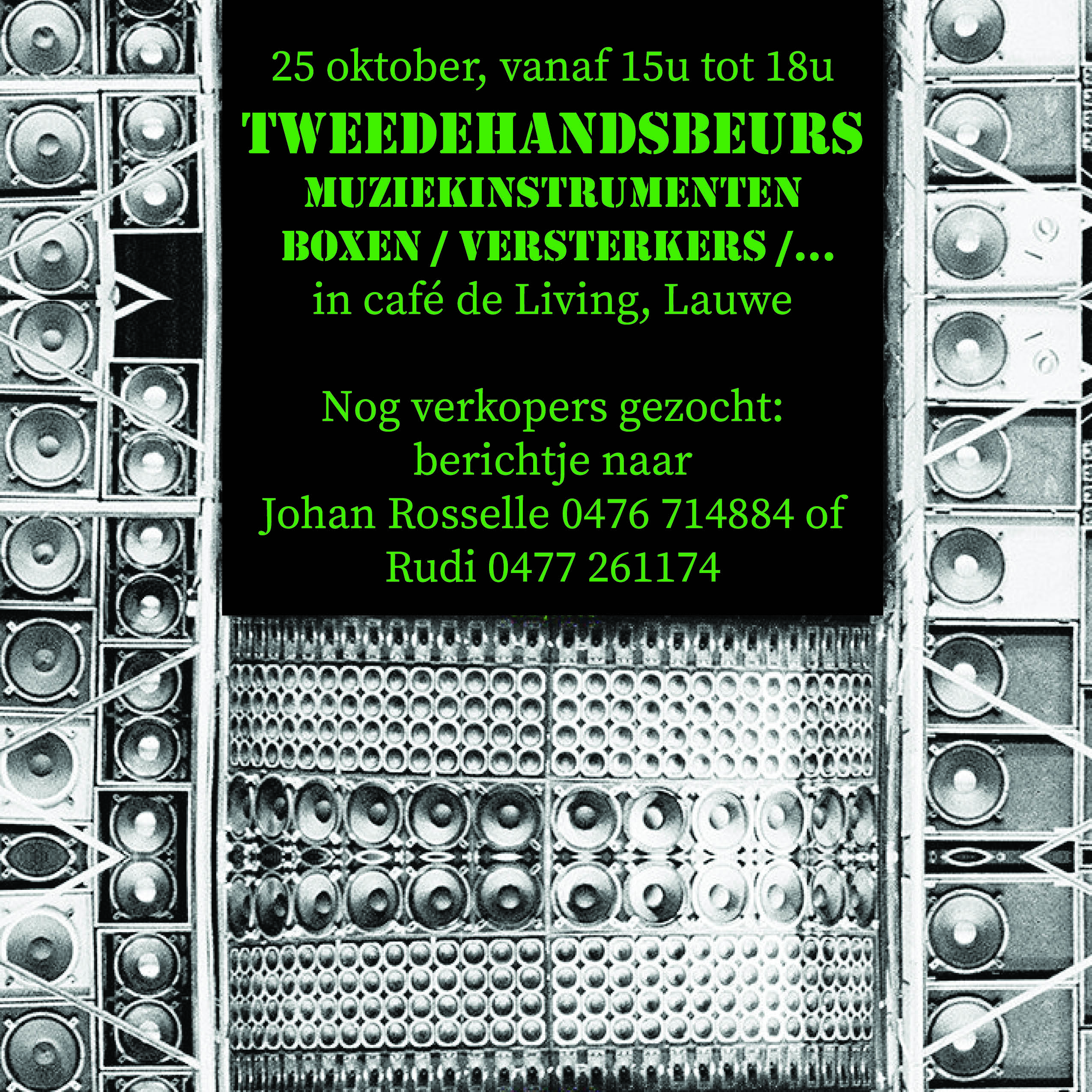 okt 25 Muziekinstrumentenbeurs by Cafe De Living Events in De Living Ook een teveel aan versterkers, stereo-installaties, pedaaltjes, Share: