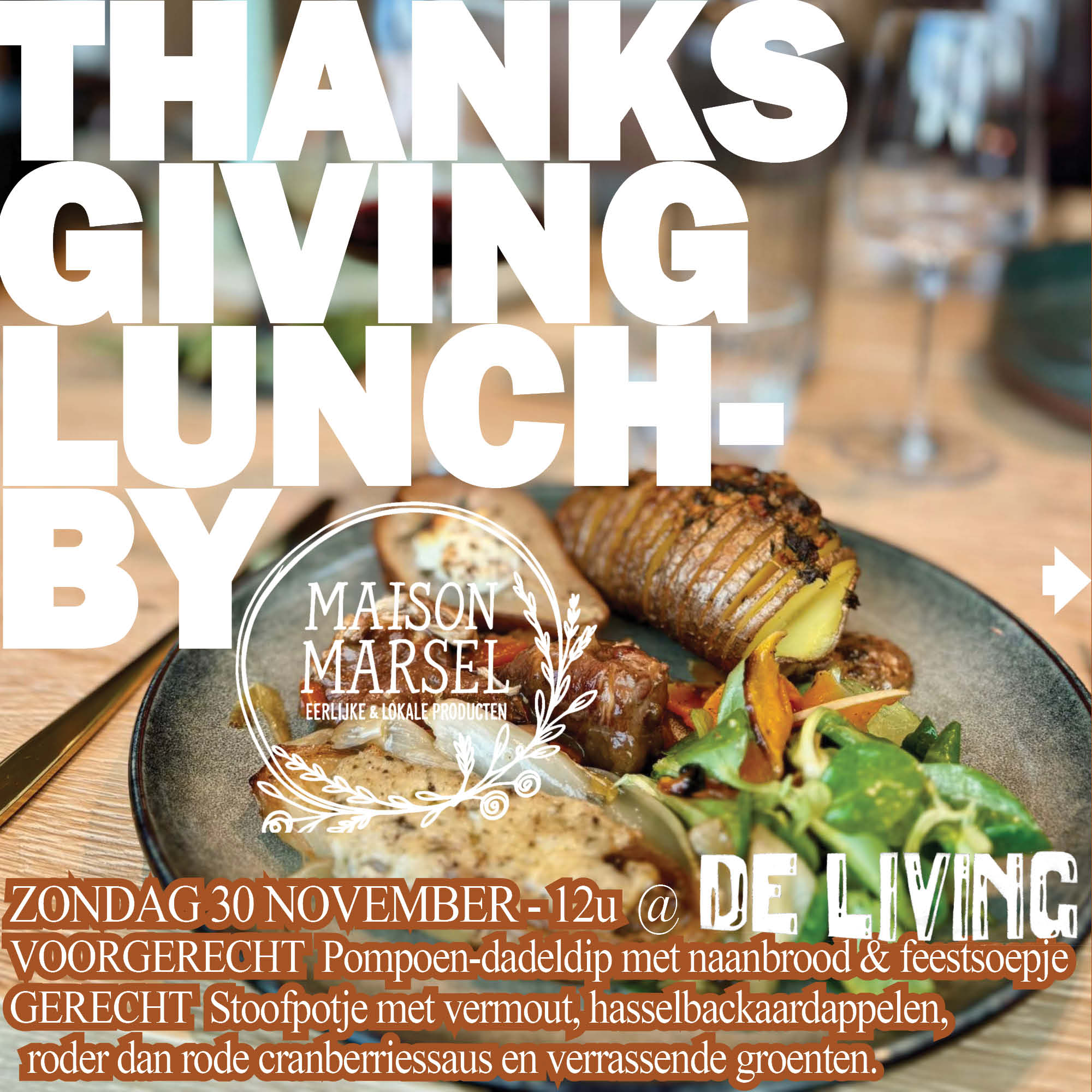 Maison Marsel laat ons reeds voorproeven van haar feestmenu voor de eindejaarsperiode! Thxgiving is voor Marsel een echte familietraditie! We halen ons mooi servies boven! Welkom om met ons mee te vieren op de Thanksgivinglunch in café de Living! Reserveren noodzakelijk via info@cafe-deliving.be of 0477 26 11 74 Voorgerechtje: Pompoen-dadeldip met naanbrood en feestsoepje Erna: Stoofpotje met vermout, hasselbackaardappelen, roder dan rode cranberriesaus en verrassende groeten €29 €15 kindermenu of kinderlasagne