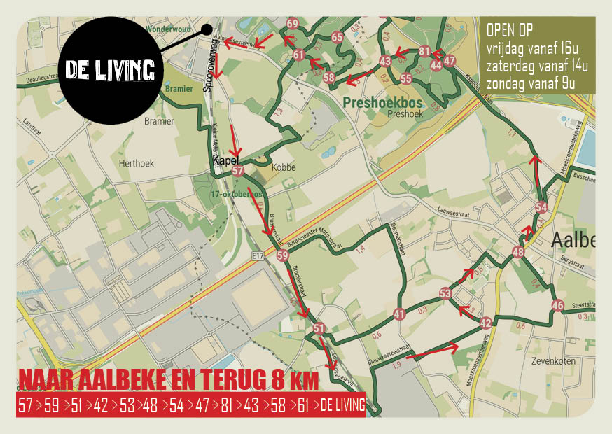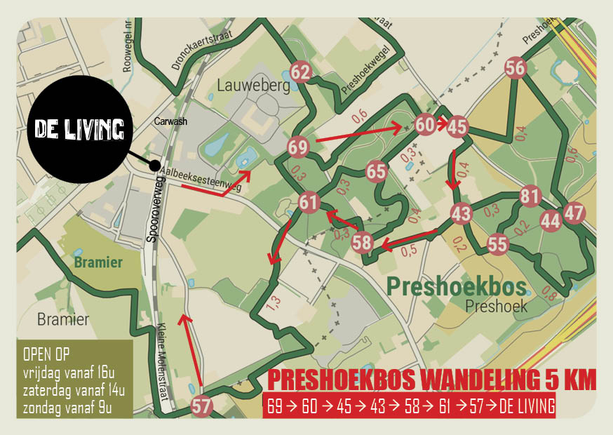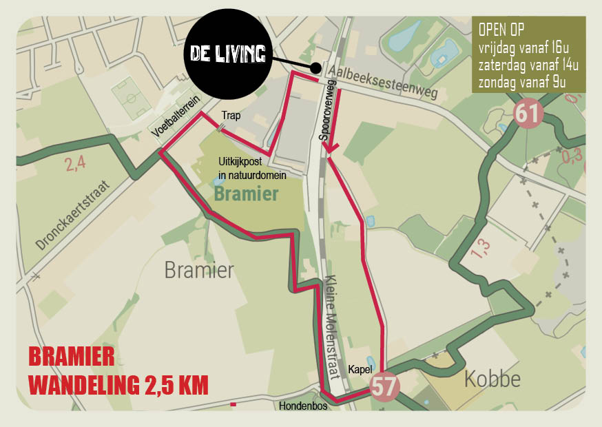 Wandelkaartjes met vertrek en eindpunt in café de Living kunnen aan de toog gevraagd worden.